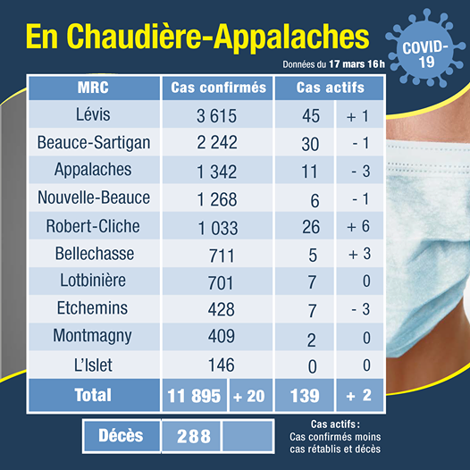 Selon le plus récent bilan lié à la COVID-19, le nombre de cas actifs dans la MRC des Appalaches est en baisse de trois, pour un total de onze. Aucun nouveau cas ne s’est ajouté au cours des 24 dernières heures.