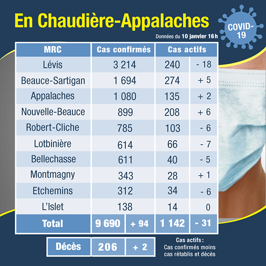 Le Centre intégré de santé et de services sociaux de Chaudière-Appalaches (CISSS-CA) rapporte 13 nouveaux cas de COVID-19 dans la MRC des Appalaches au cours des 24 dernières heures. Le nombre de cas actifs est à présent de 135, en hausse de deux par rapport à hier. À noter qu’il s’agit du plus haut total de cas actifs recensés dans la région de Thetford depuis le début de la pandémie. Le nombre de décès demeure inchangé à 31.