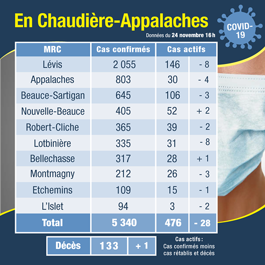 28 novembre : 80 nouveaux cas confirmés et deux décès; une personne demeurait à la résidence privée pour aînés Mgr Bourget à Lévis, une personne résidait à domicile dans la MRC Nouvelle-Beauce.