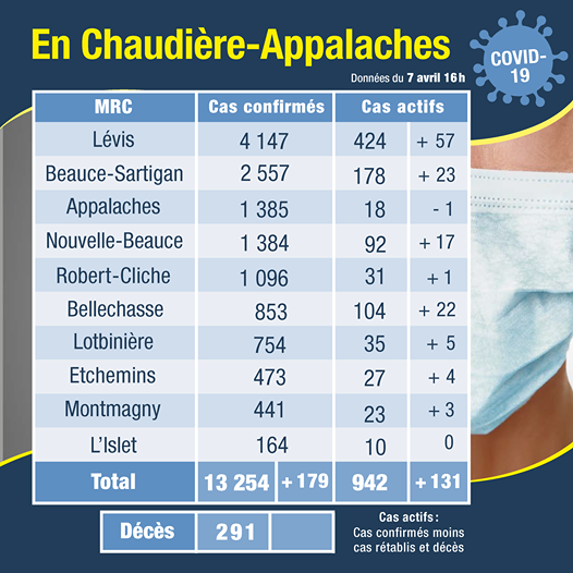 Le nombre de cas actifs est quant à lui en hausse de 131 par rapport à hier (total de 942). La région compte deux hospitalisations de plus, pour un total de 14, dont quatre en soins intensifs. Le nombre de décès demeure à 291.