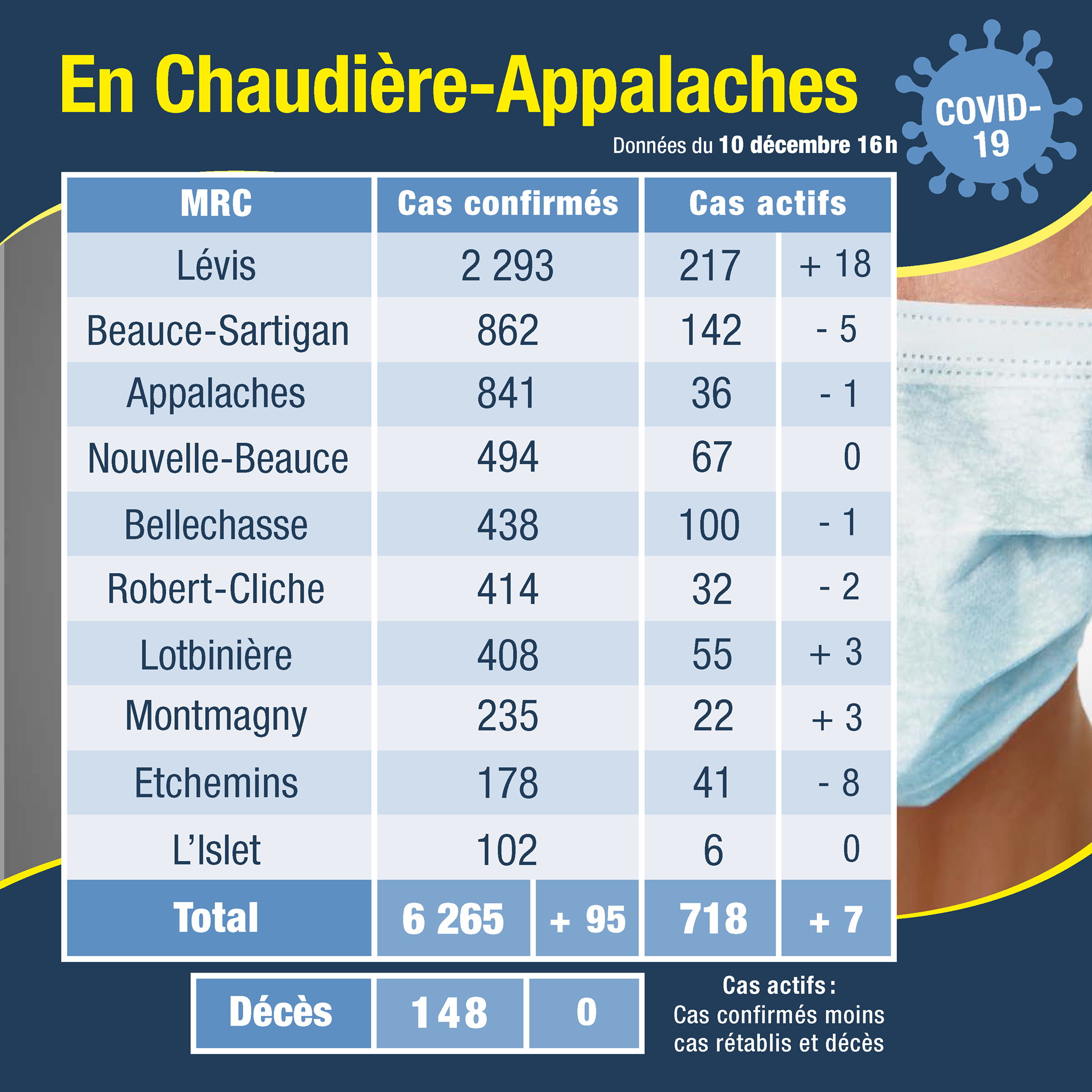 - Aucun décès supplémentaire. Le nombre total de décès en Chaudière-Appalaches demeure à 148.