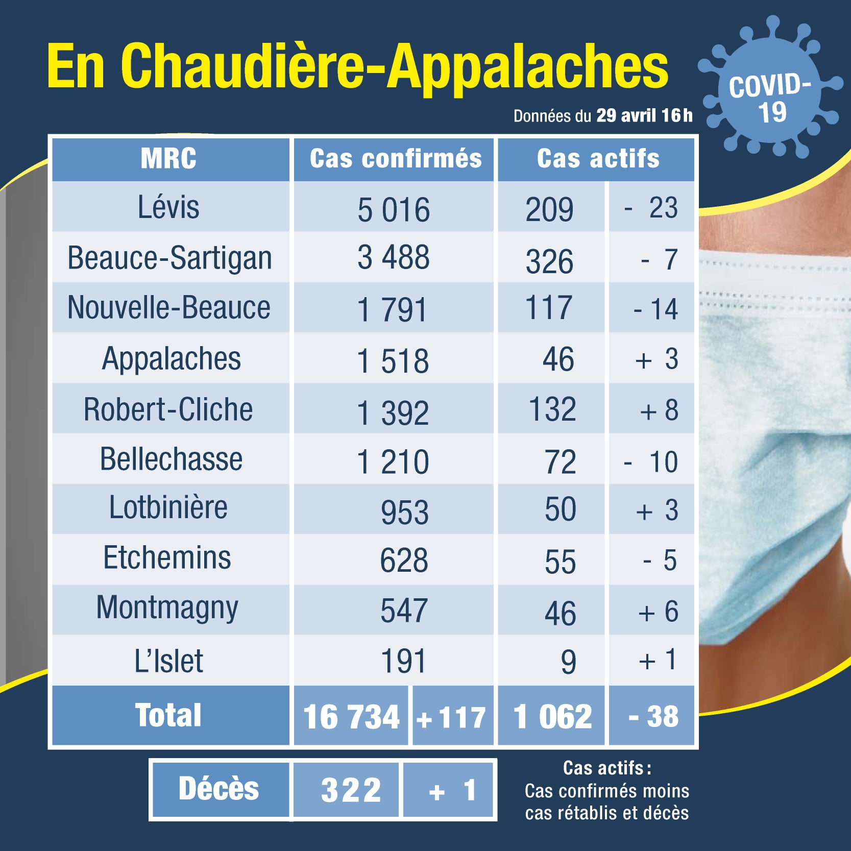 - Un nouveau décès (total de 322).