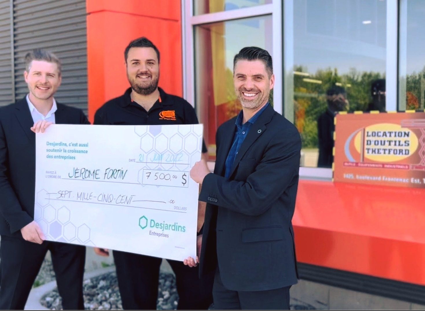 En compagnie de Christian Jacques et Christian Poulin de Desjardins/Desjardins Entreprises, Jérôme Fortin, directeur général de Location d’Outils Thetford et diplômé de la cohorte Émergence G14, s’est vu décerner une bourse de 7500 $ qui vise à soutenir un entrepreneur de la région. Félicitations!