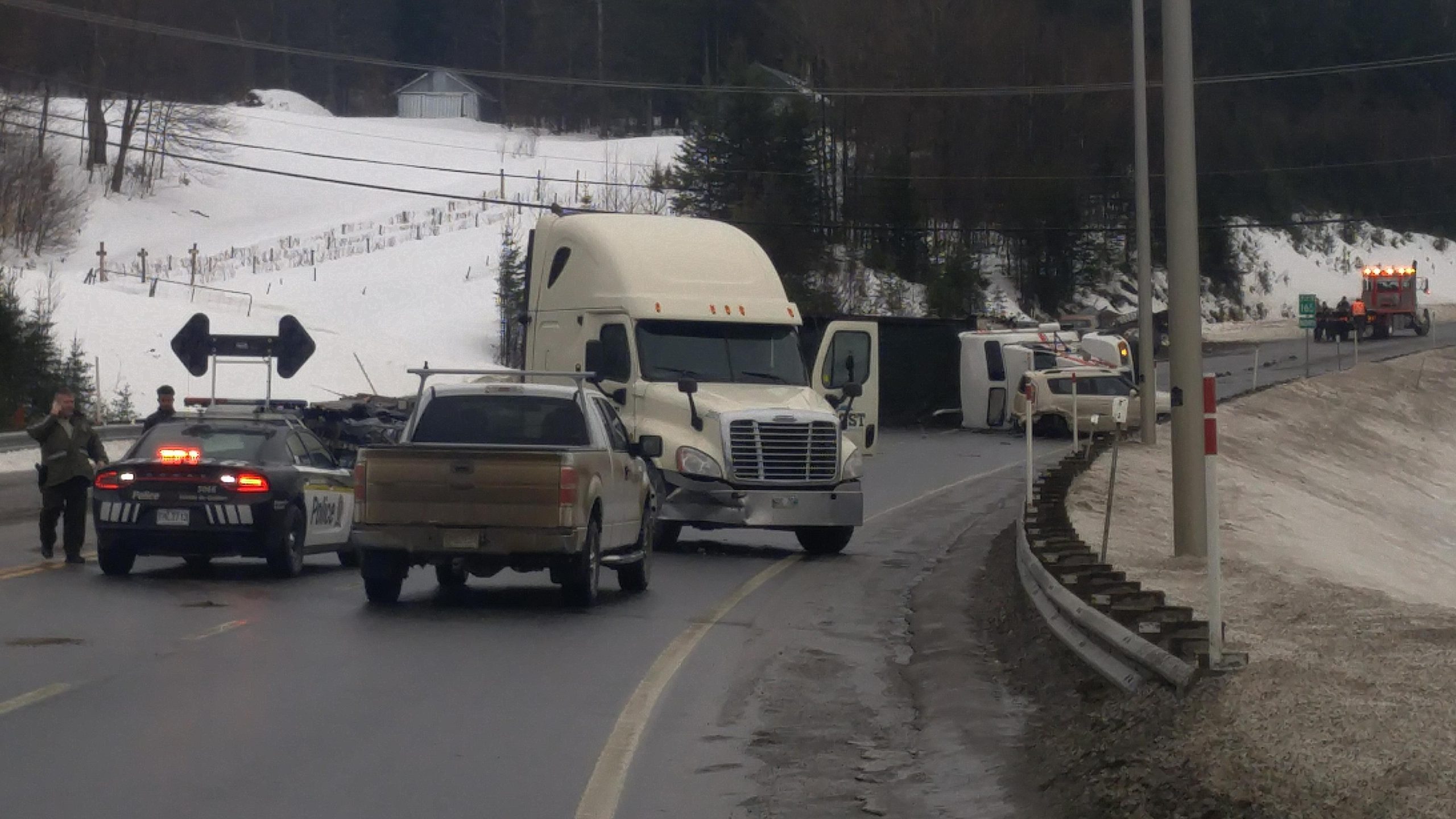 Peu après, les intervenants d’urgence ont assisté à la perte de contrôle d’un autre véhicule. En effet, alors que les secours étaient au travail sur le premier accident, un autre camion remorque a dérapé en descendant la côte. «Il a percuté un garde-fou et le conducteur a réussi à braquer son mastodonte de l’autre côté du camion renversé. Plusieurs personnes ont eu toute une frousse. Pour se protéger les gens sautaient par dessus le garde-fou», a expliqué le maire de Saint-Ferdinand, Yves Charlebois, qui se trouvait sur place à ce moment. Ce dernier est ensuite allé plus loin sur la route afin de détourner la circulation.
